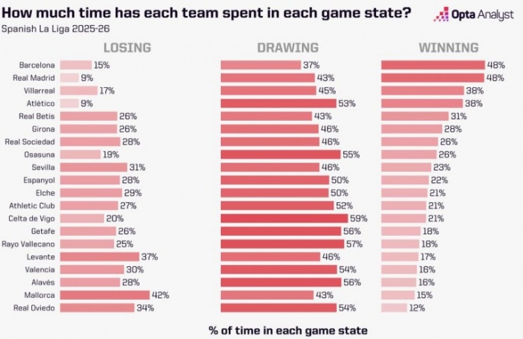 巴萨本赛季西甲15%时间处于落后多于皇马,但球队落后下抢回18分